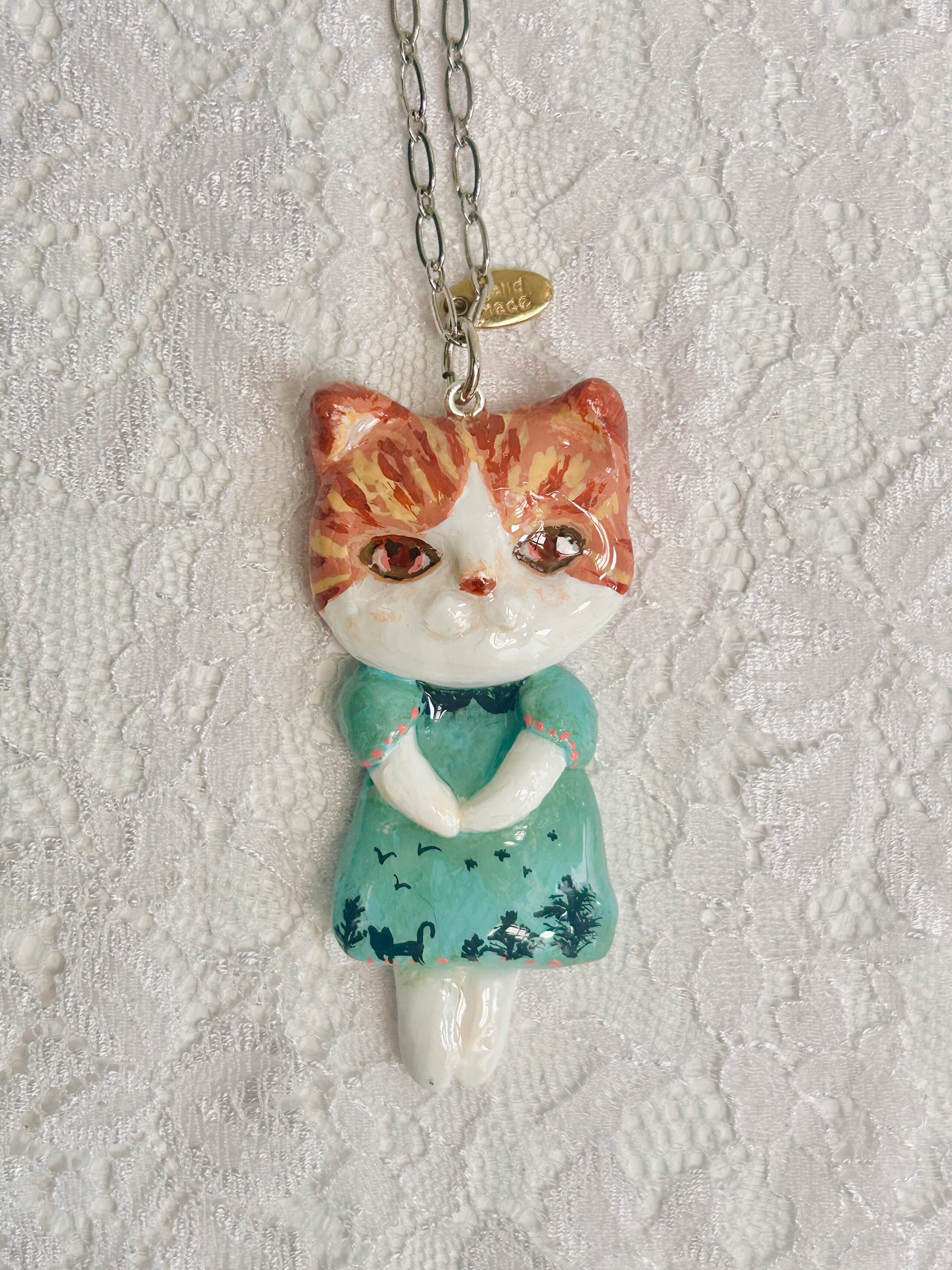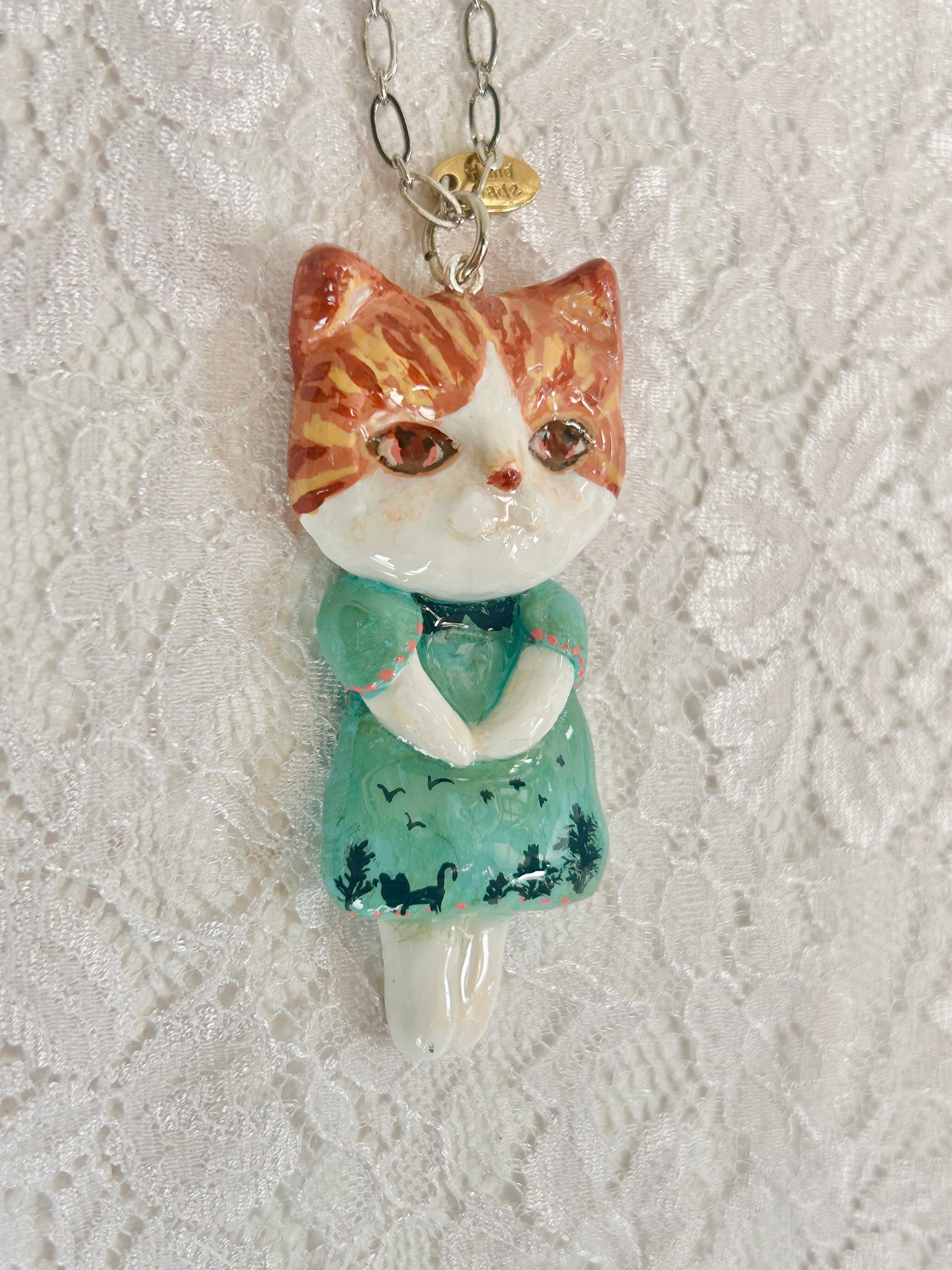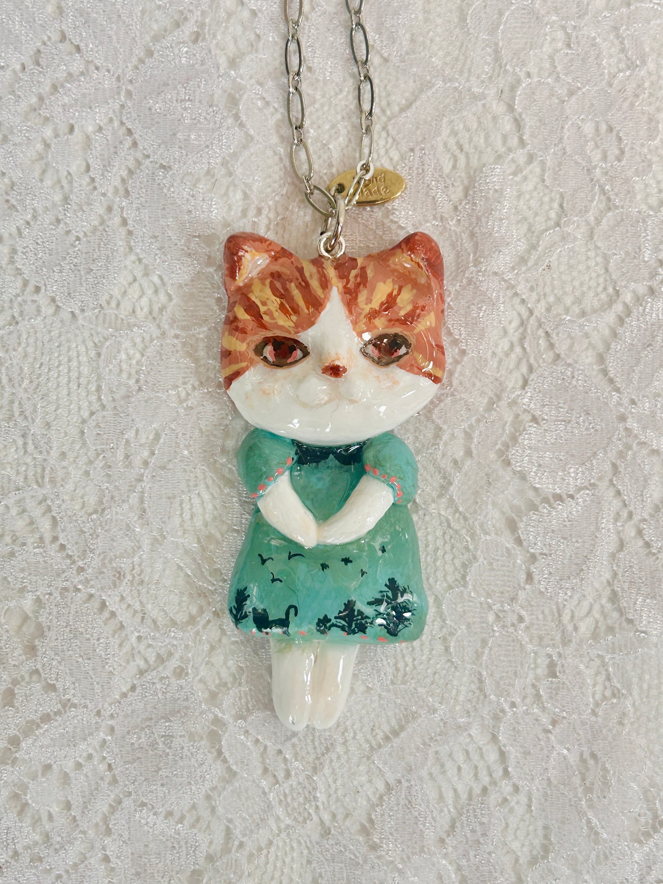 青いワンピを着たねこのペンダントです。