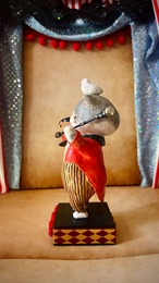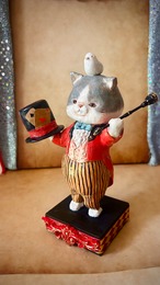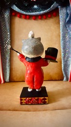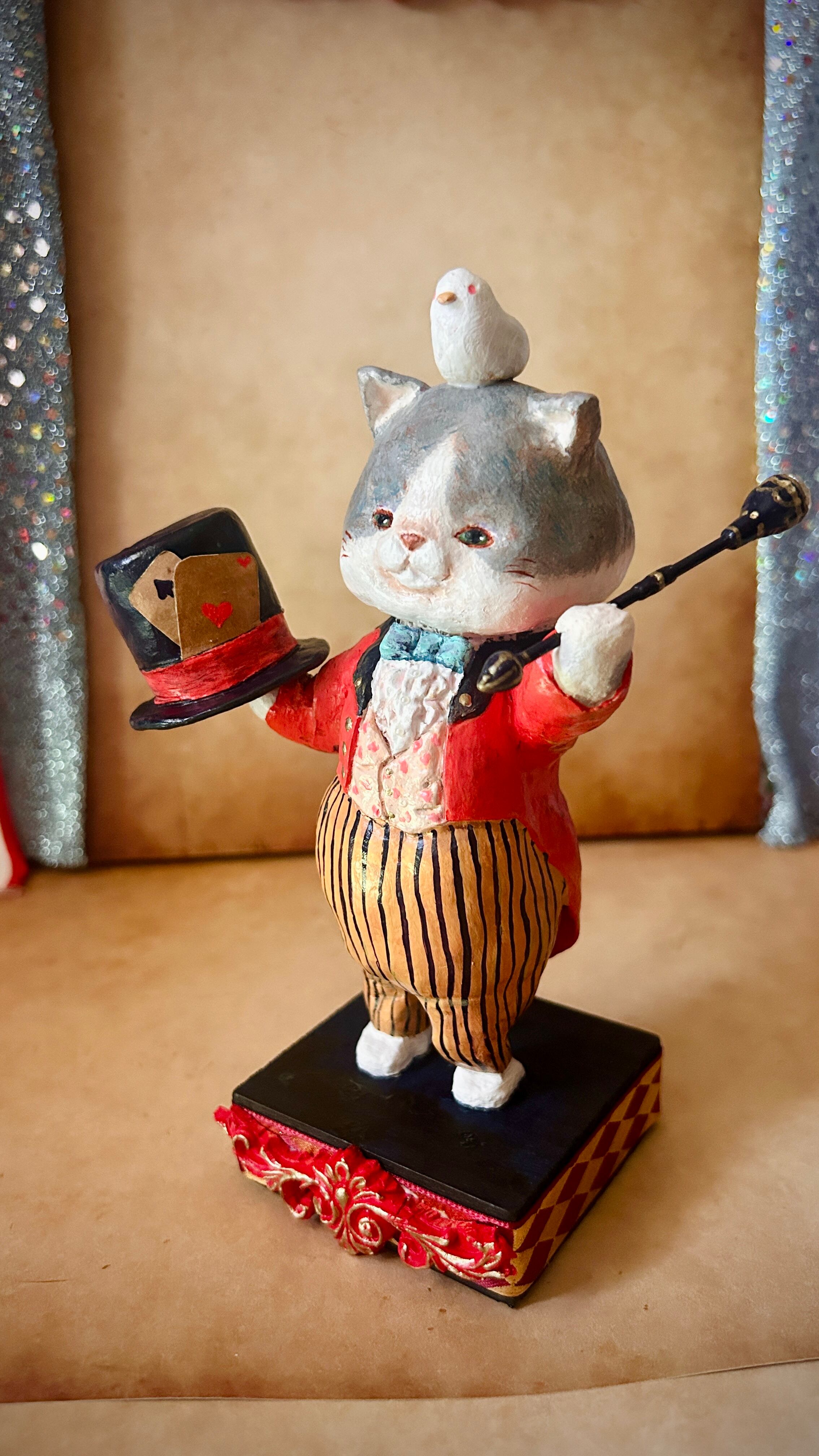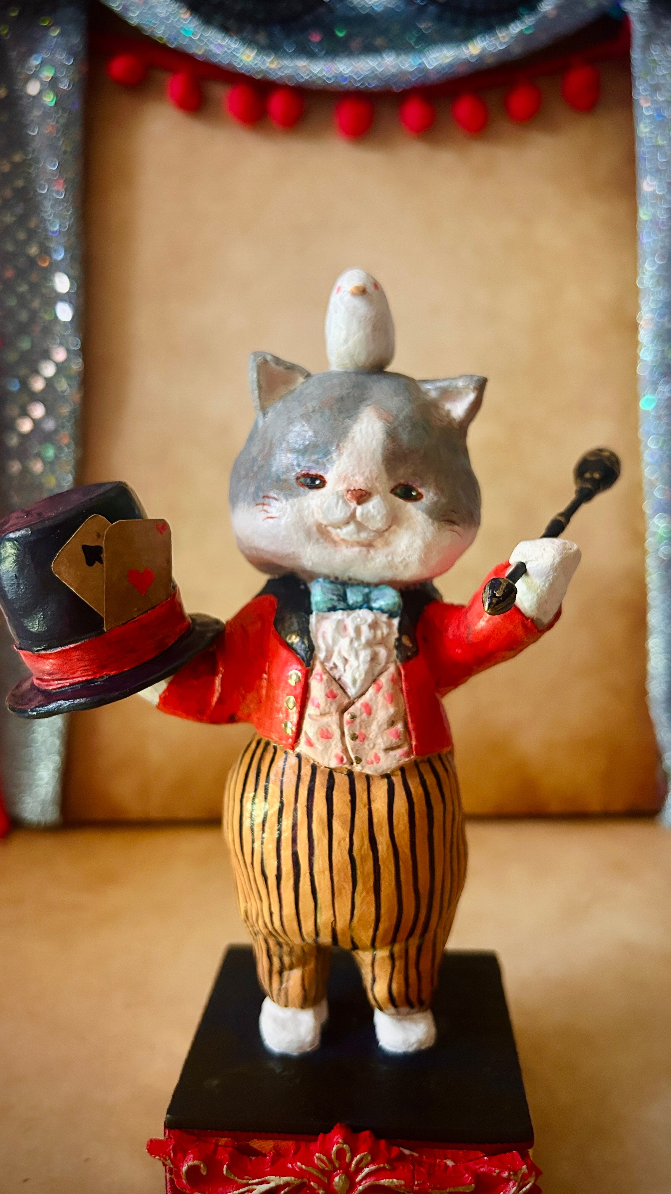 He is a cat magician with chubby cheeks and dressed in a stage costume.