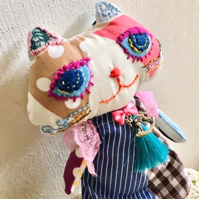 素材 <人形> 綿、ポリエステル、プラスチック(ボタン)、合金(胸元のチャーム)