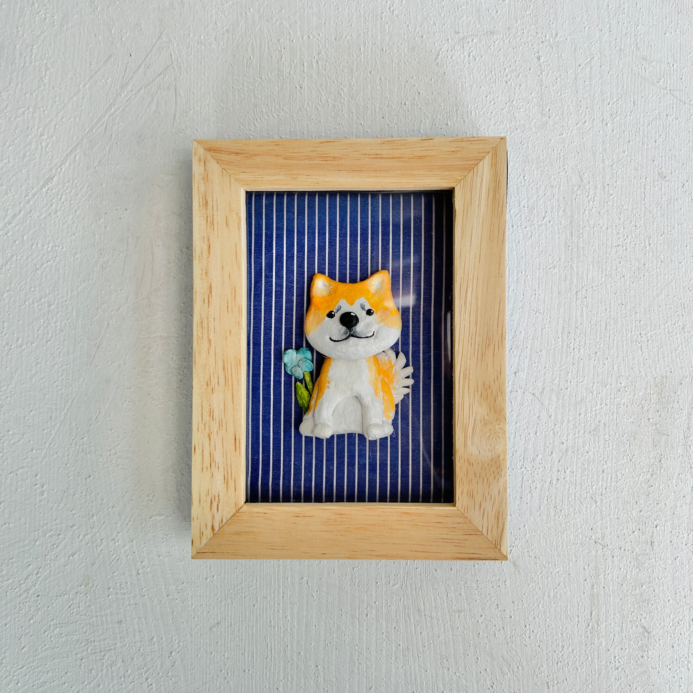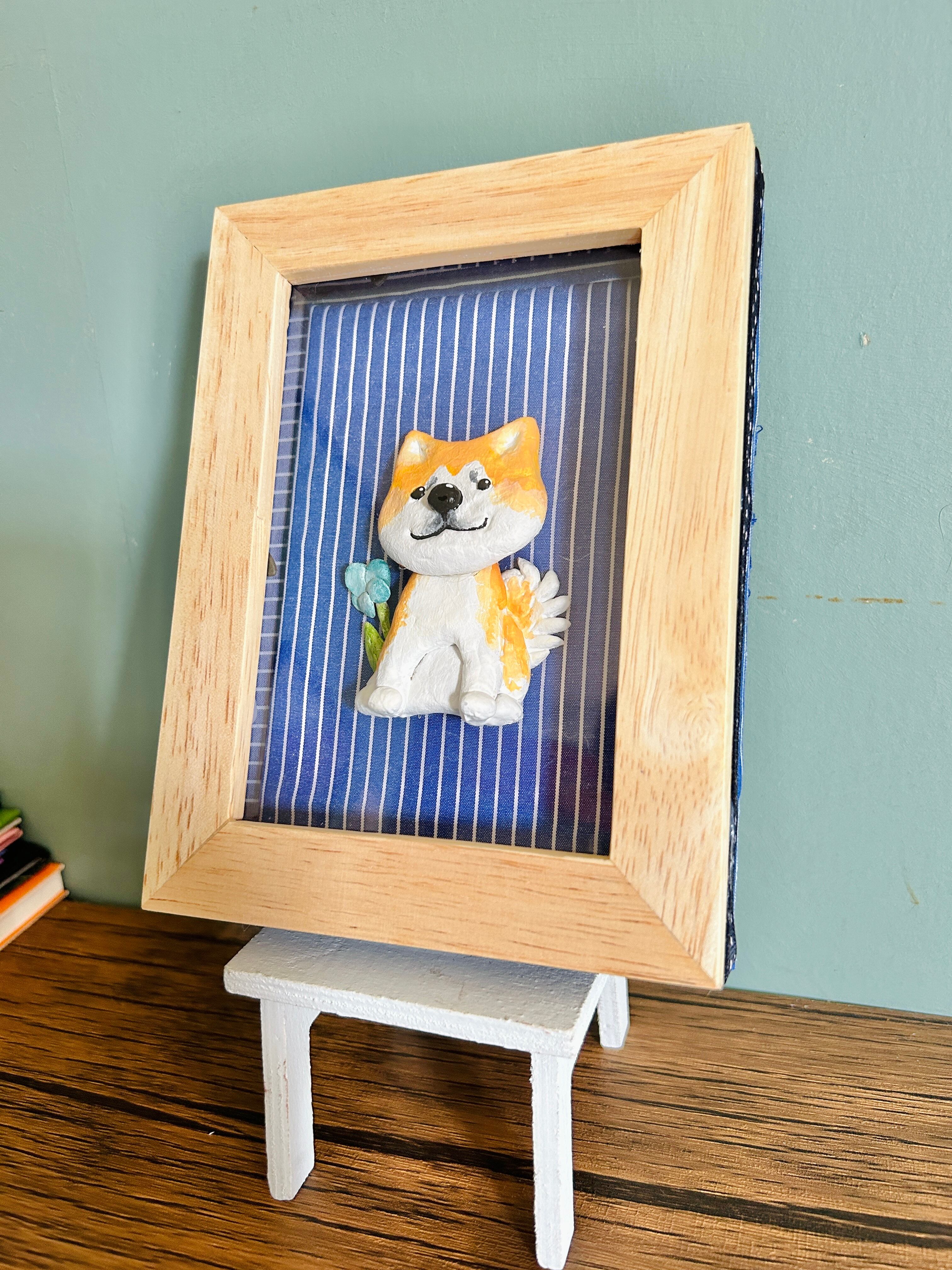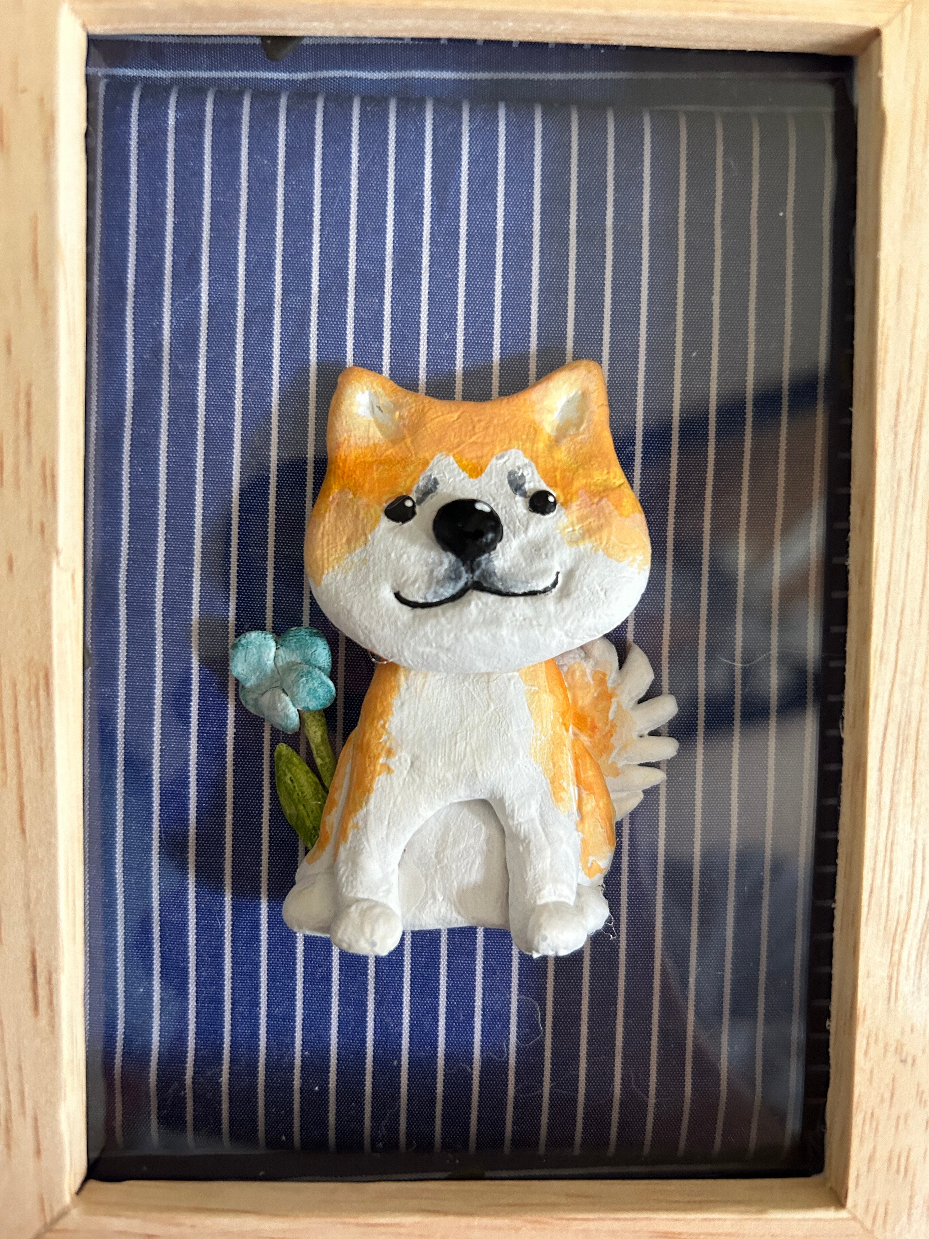 秋田犬、あきたちゃん立体作品です。 にっこにっこで見つめる黒い目とピカピカのお鼻が、いつだって元気をくれます。 赤毛、虎毛、白毛、それから長毛をお選びください。 (背景の色など、仕上がりはお任せになります) 小さなイーゼルがセットになります。 サイズ: 縦 16cm 横 12cm 厚み 2.6cm 素材: 木粉粘土、クレイ、木材、布、プラスチック(土台)、アクリル(カバー)